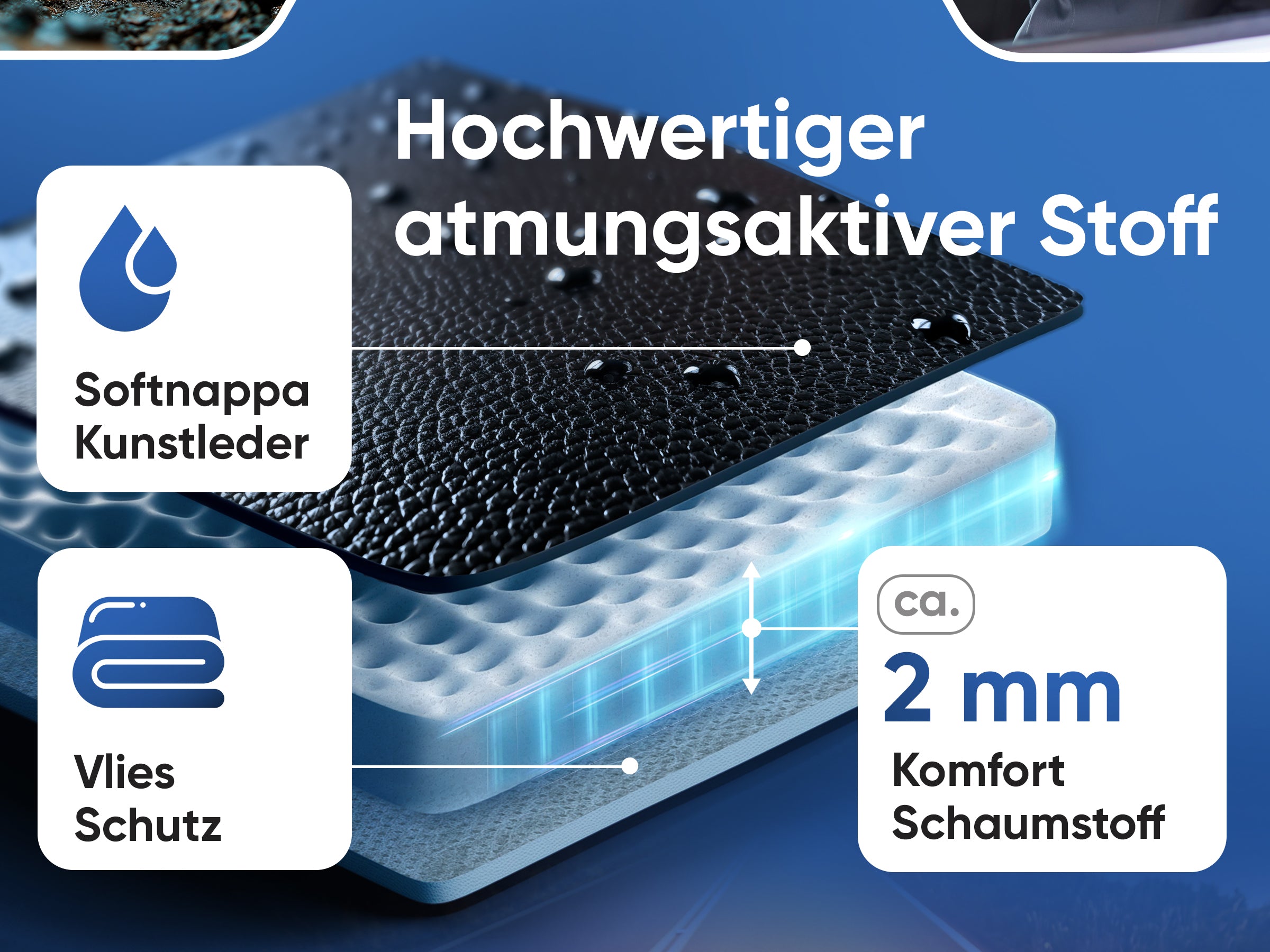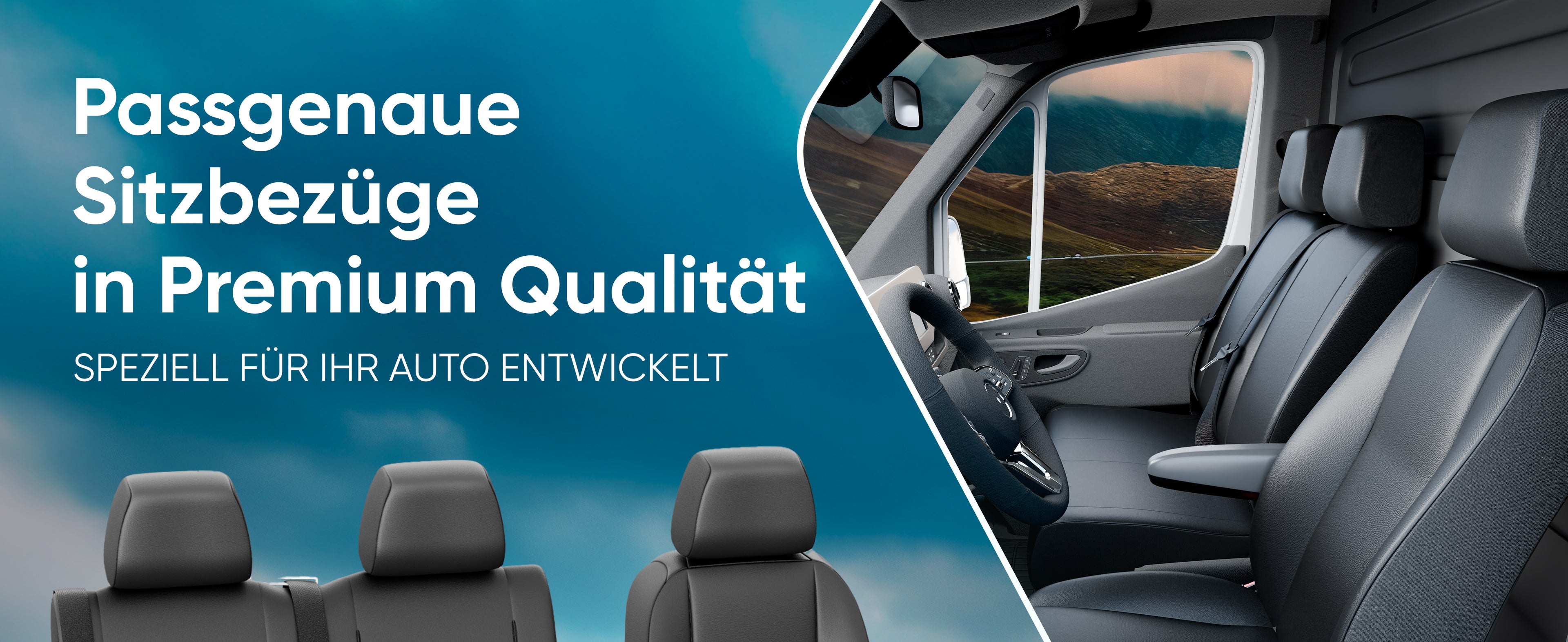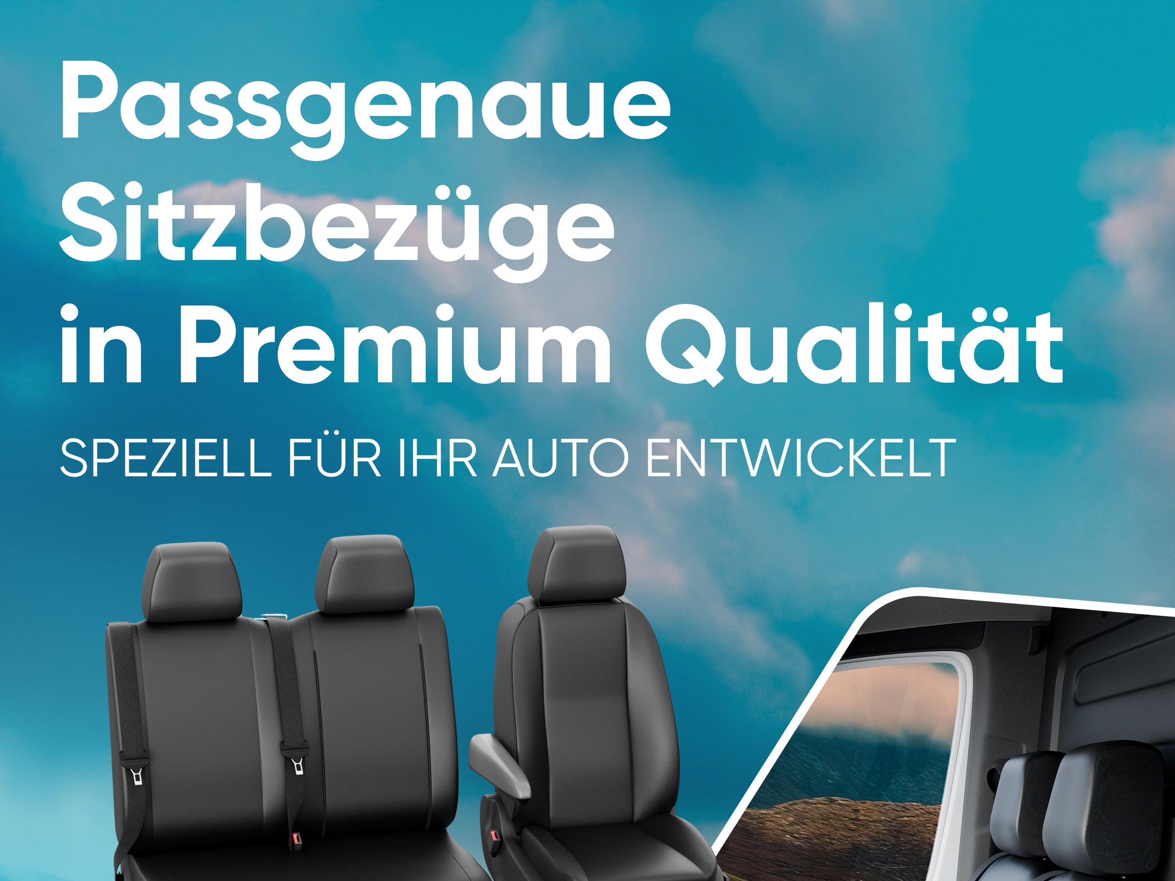 Klares Hero-Visual: Saubere, hochauflösende Renderings der Sitzbezüge mit Fokus auf Passgenauigkeit und Materialqualität. Kunden erkennen sofort, was sie erwartet.