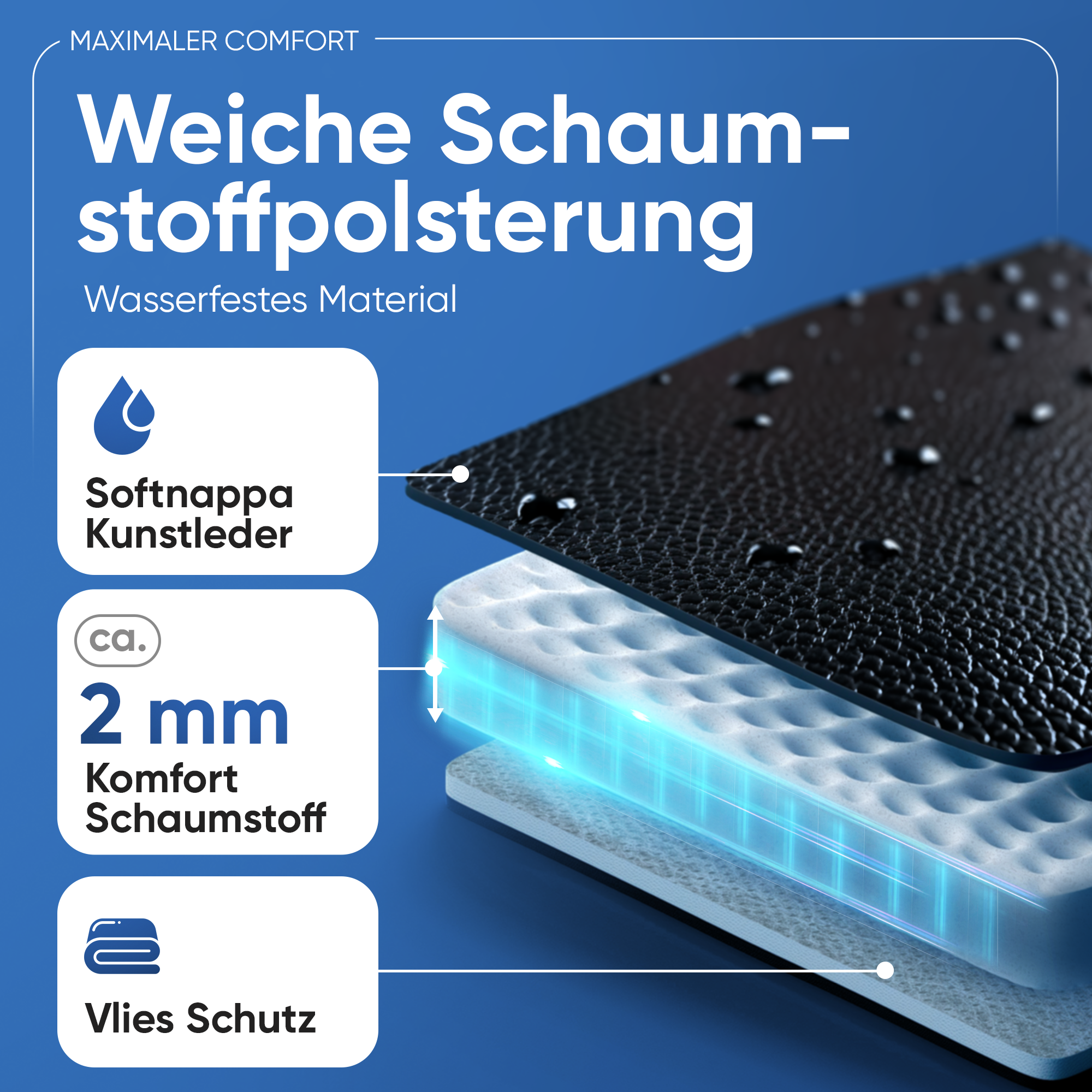 Feature-Highlights: Mit Icons und prägnanten Text-Overlays heben wir Kernvorteile wie Wasserfestigkeit, Polsterkomfort und einfache Montage hervor. Alles klar strukturiert für schnelle Erfassung – ideal für Amazon-Kunden.