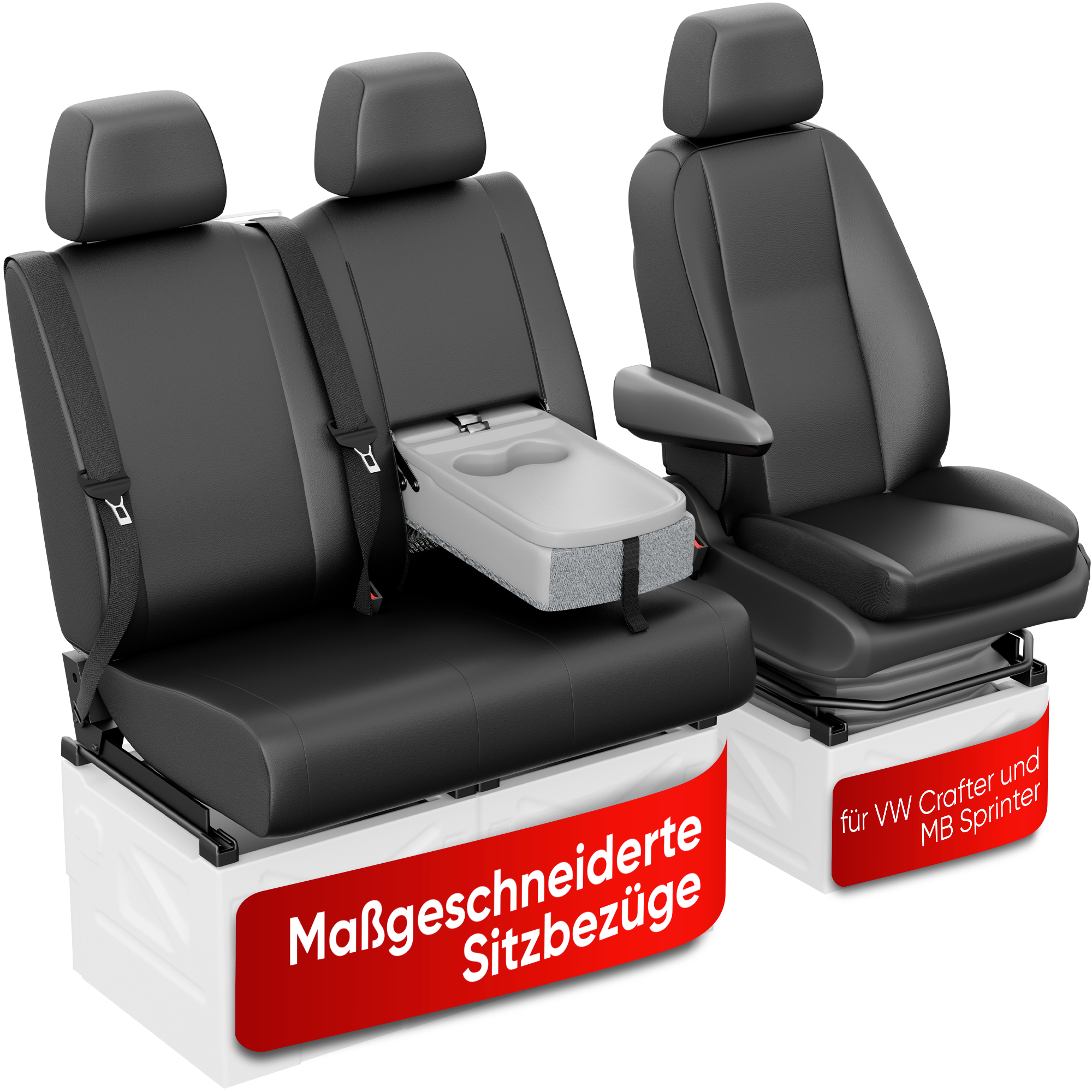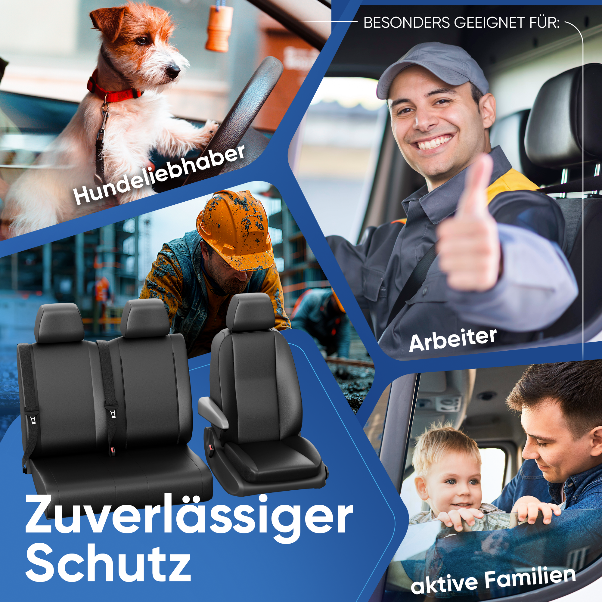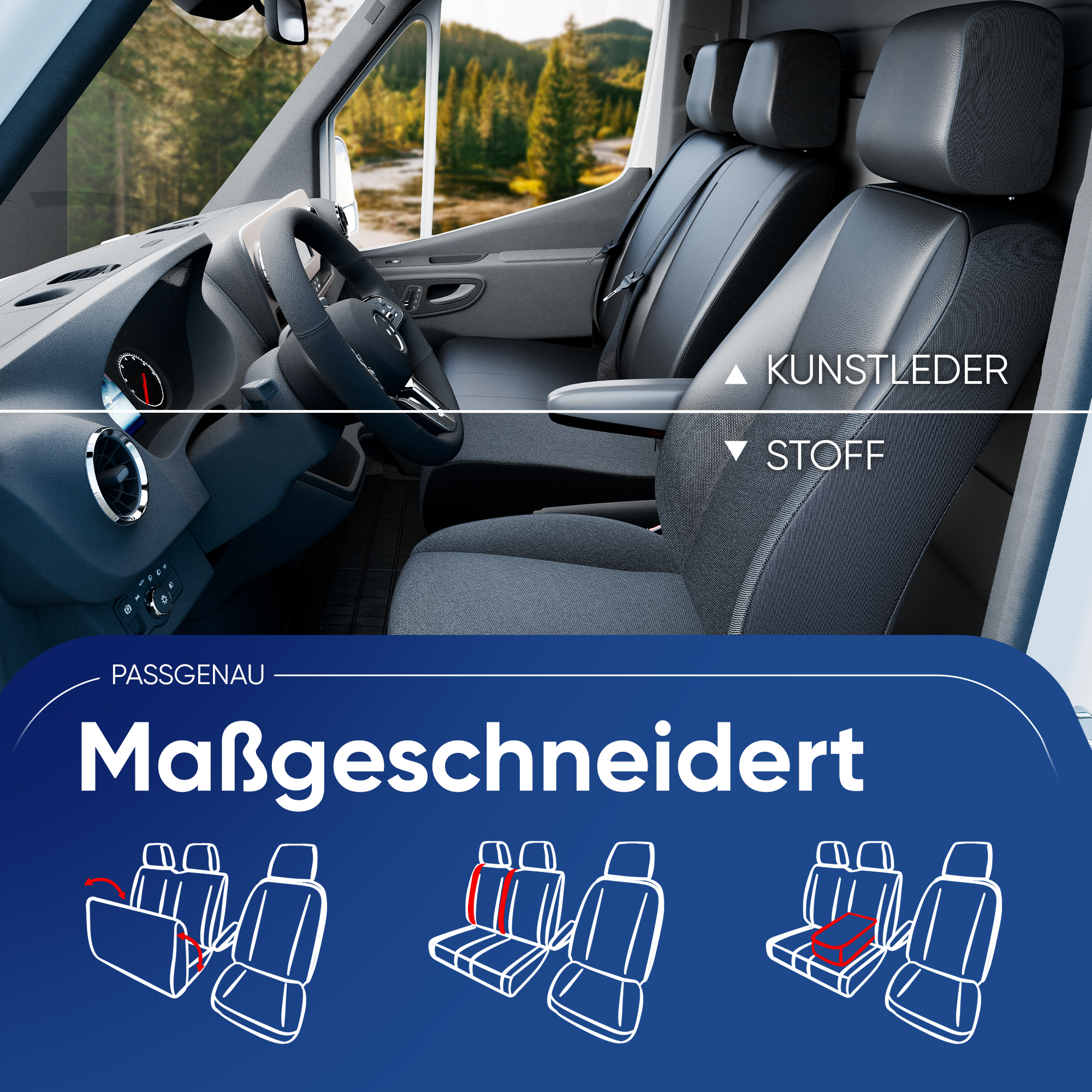 Set-Komposition: Ein übersichtliches Breakdown-Bild zeigt den Lieferumfang (Sitzbankbezug, Einzelsitzbezug, Kopfstützenbezüge). So vermeiden wir Rückfragen und stärken die Kaufentscheidung.