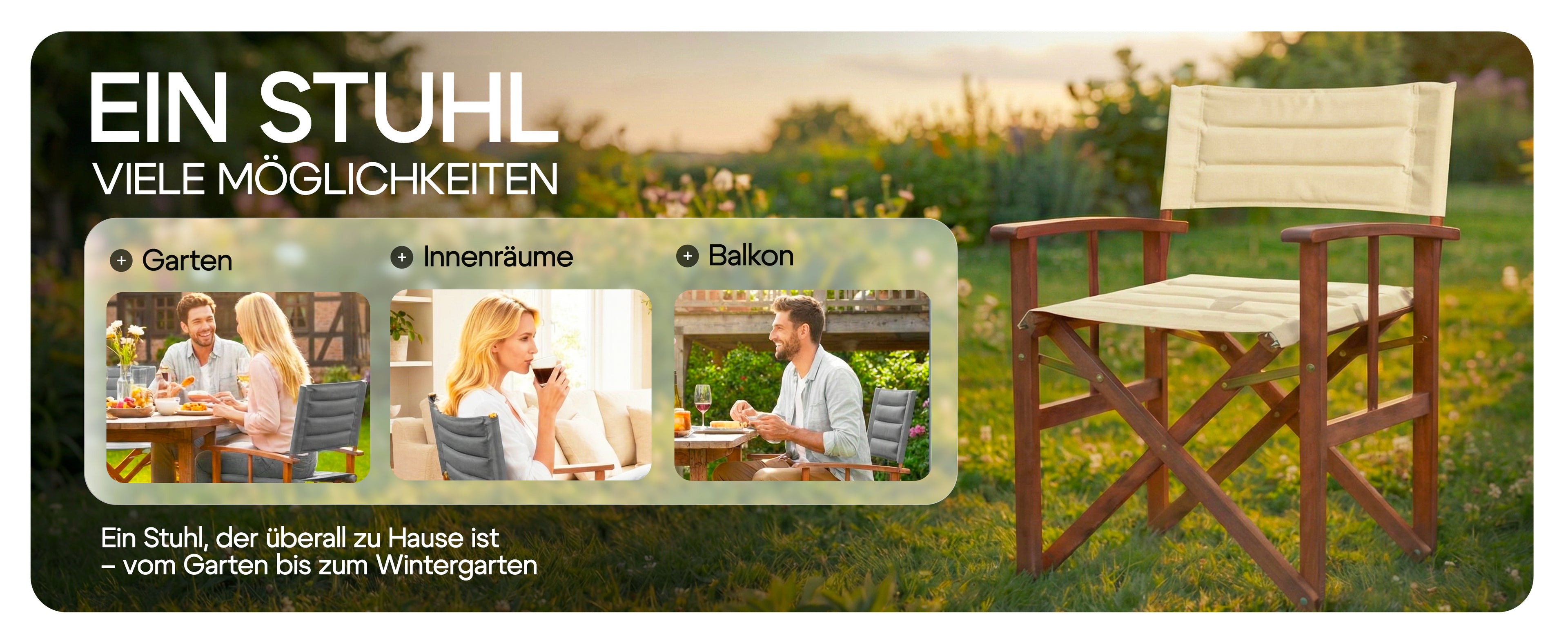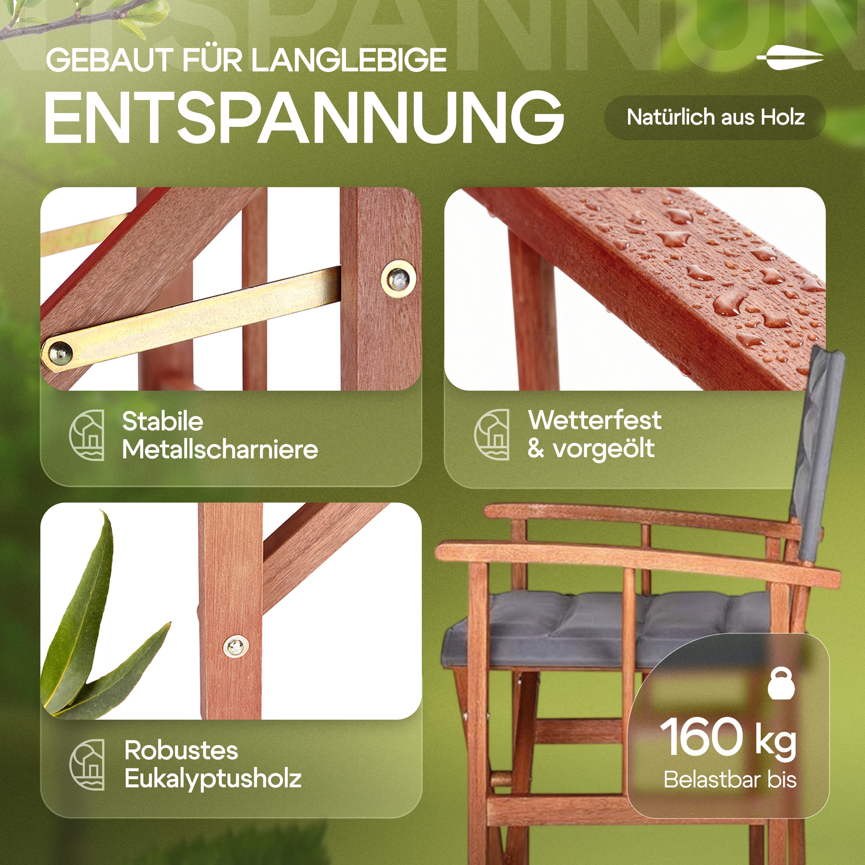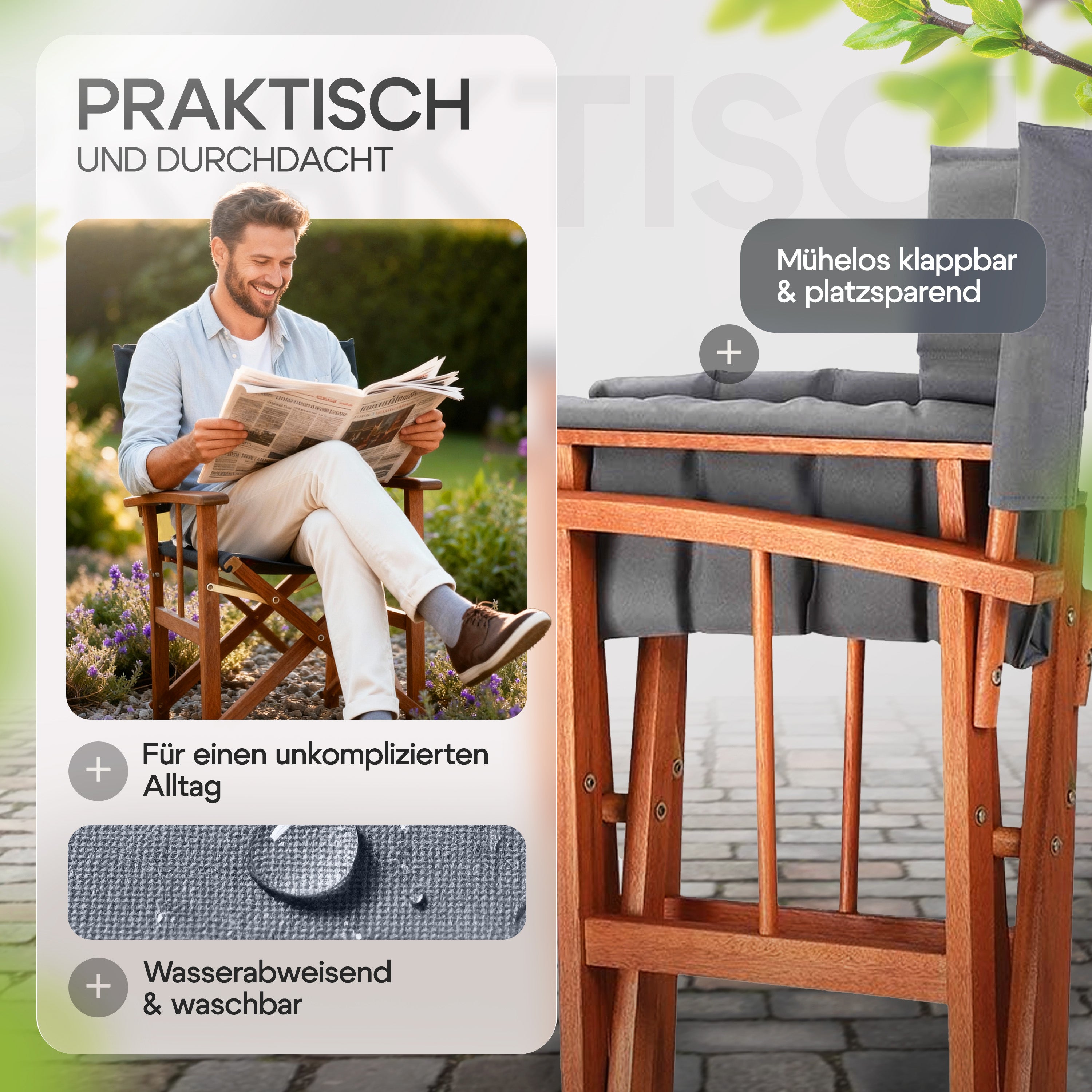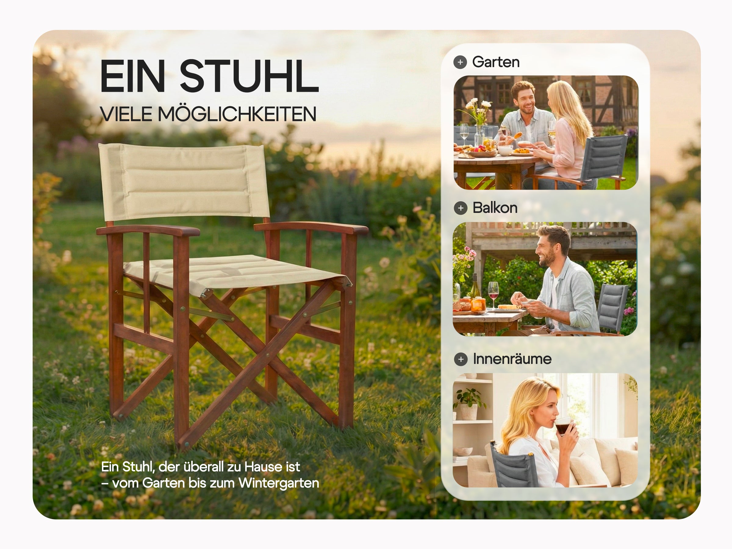 Die Herausforderung bestand darin, einen klassischen Regiestuhl als langlebiges Premium-Möbelstück für den Außenbereich zu positionieren. Es galt, die Brücke zwischen der rustikalen Ästhetik von Eukalyptusholz und der modernen Funktionalität (Wetterfestigkeit, Belastbarkeit) zu schlagen, um sich von günstigen Alternativen abzuheben.