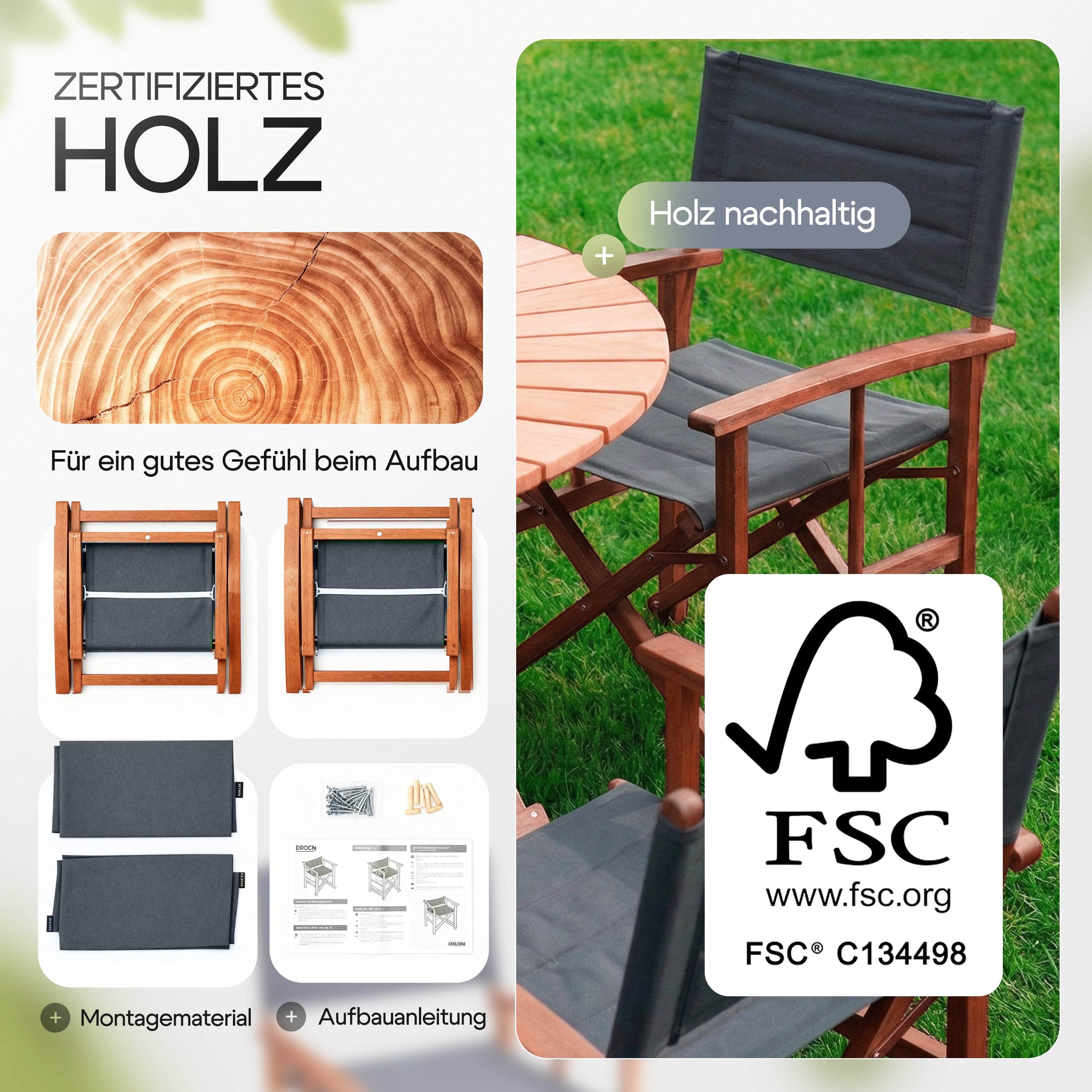 Nachhaltigkeit: Sichtbare Platzierung des FSC-Zertifikats und Fokus auf nachhaltiges Eukalyptusholz für die umweltbewusste Zielgruppe.