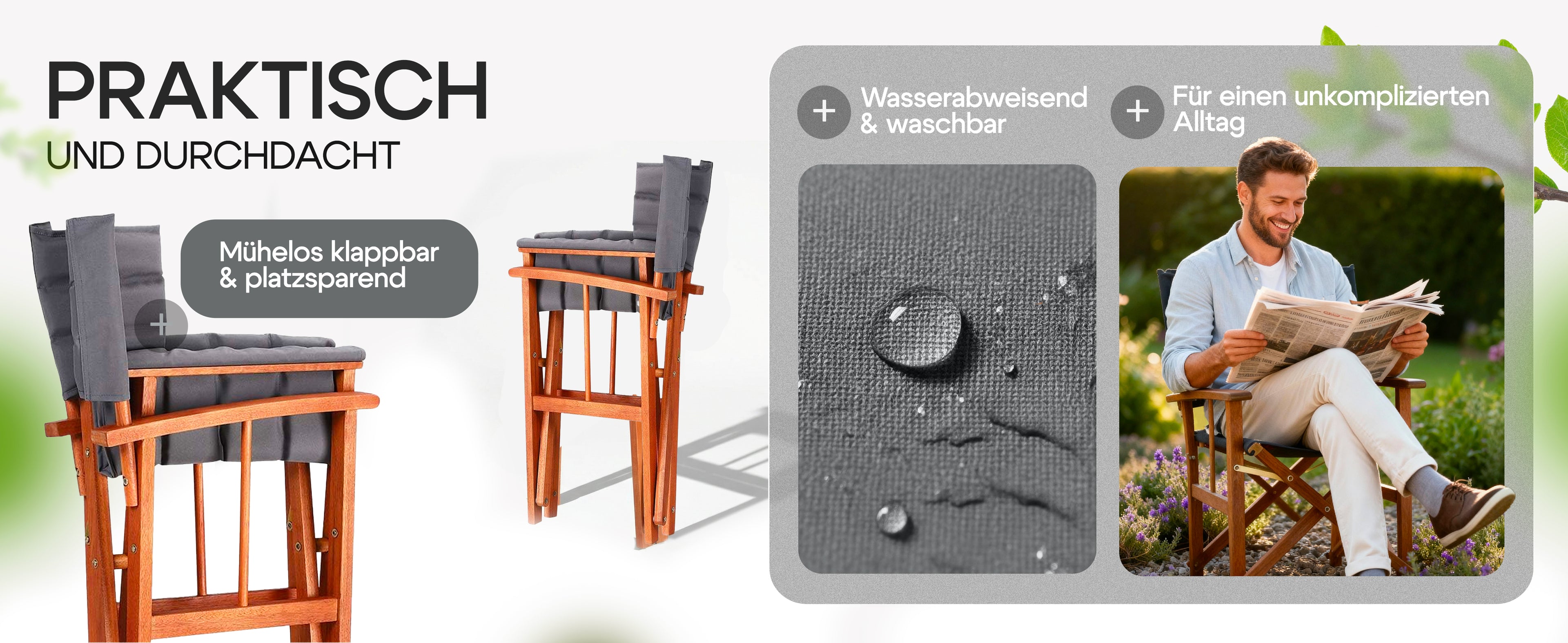 Diese Bildserie verbindet „Natur mit Technik“, indem sie durch Material-Nahaufnahmen Qualitätsvertrauen schafft und die emotionale Nutzung im Grünen visualisiert.