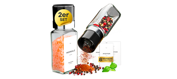 Infografiken: Klare Darstellung der Mahlgrade, Keramikmahlwerk, Gewürzsticker und Ergonomie