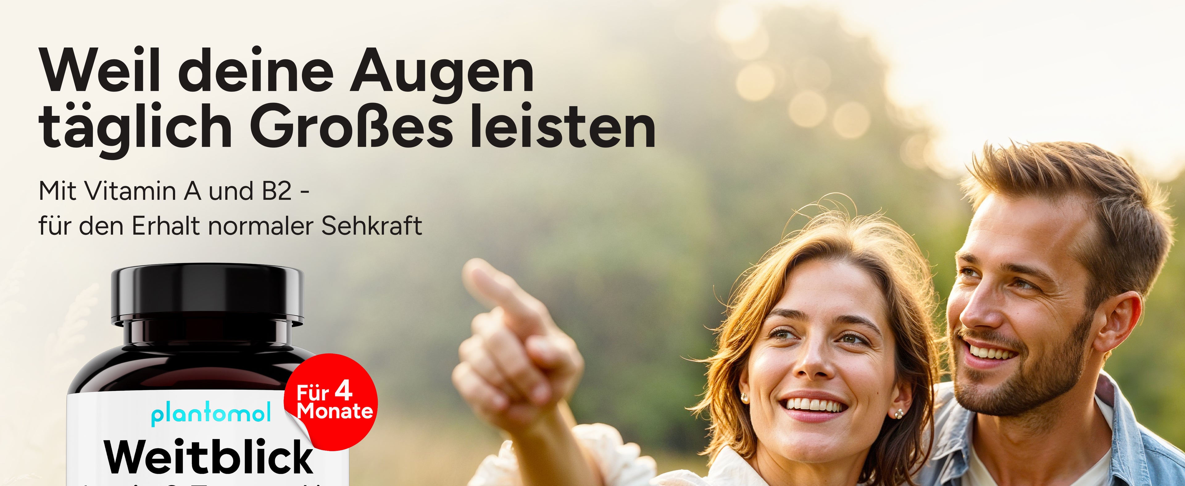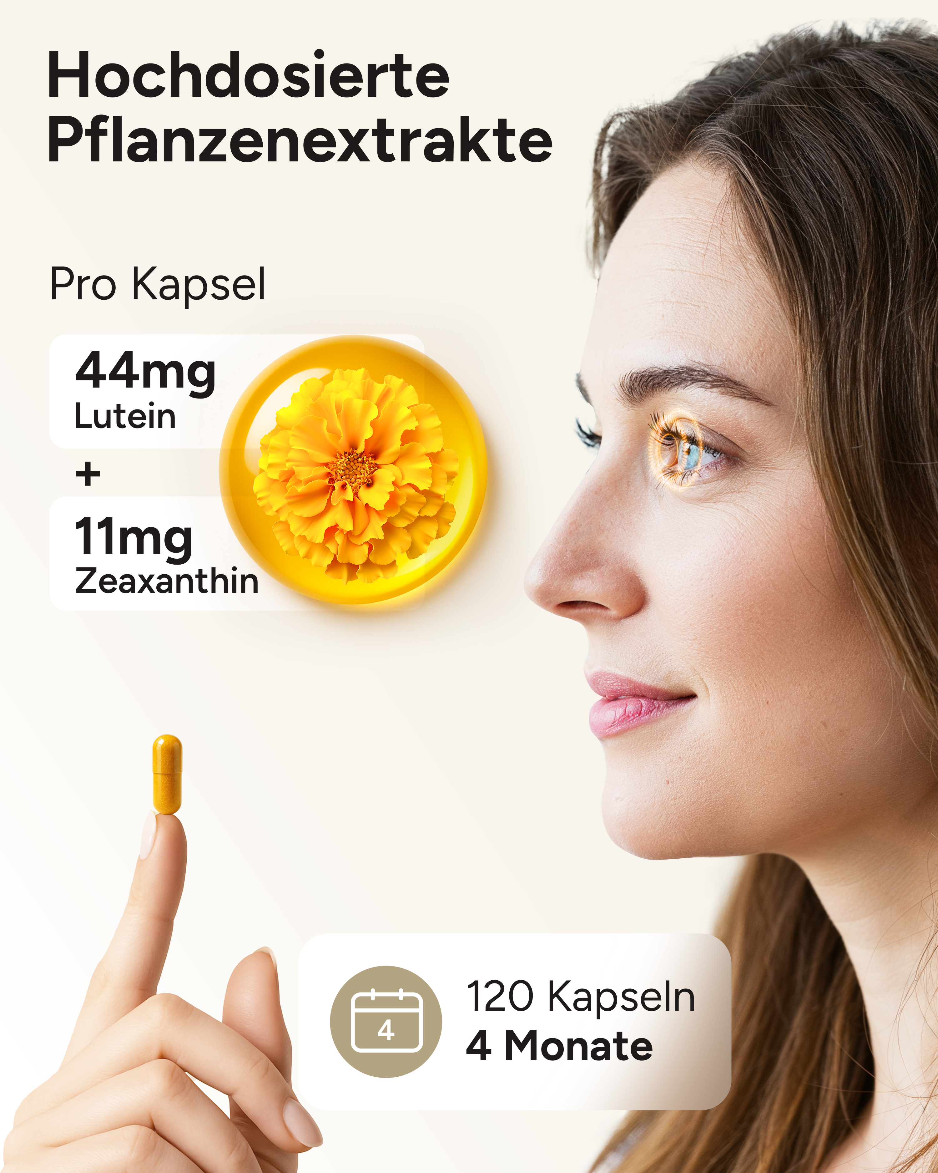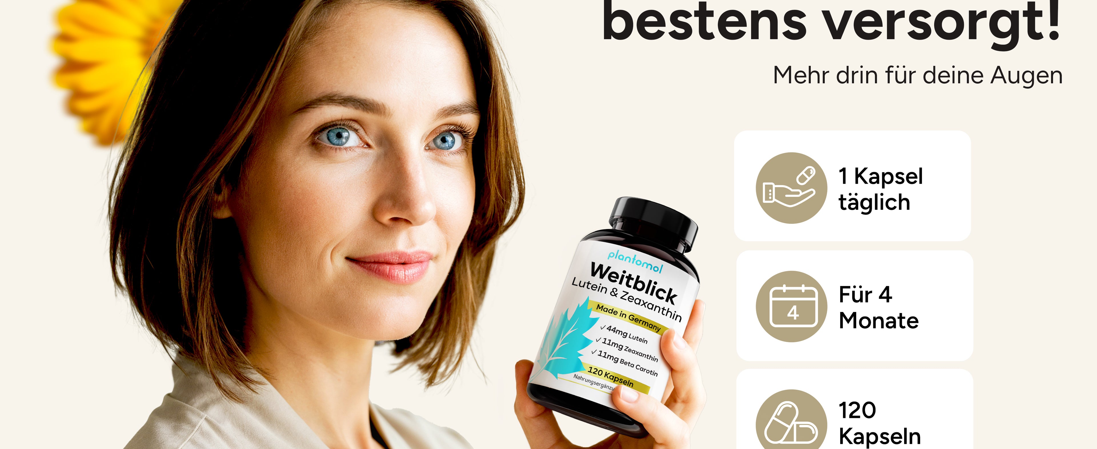 Dieses Visual kombiniert Lifestyle und Wissenschaft: eine Frau mit klarer Augenreflexion, ergänzt durch die Wirkstoffgrafik mit Lutein und Zeaxanthin. Die Darstellung der einzelnen Kapsel als kleines Highlight verstärkt die Wahrnehmung der hohen Dosierung. Die 4-Monats-Angabe schafft Vertrauen in den Vorrat.
