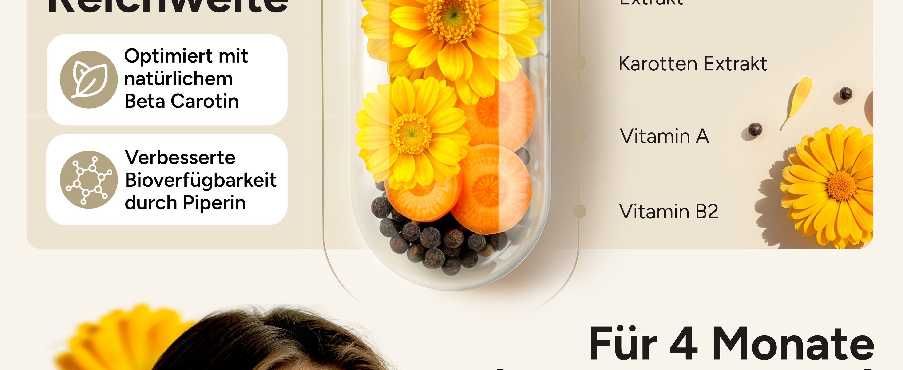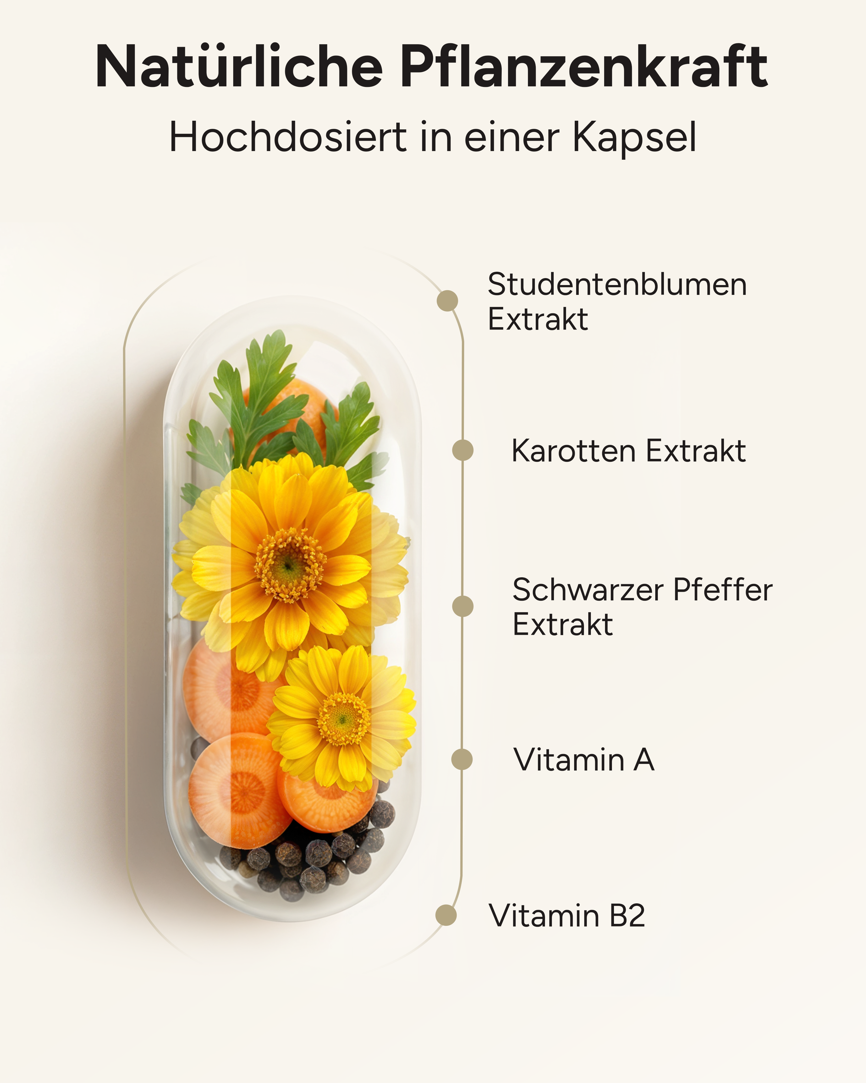 Ein ästhetisches Inhaltsstoff-Visual zeigt eine transparente Kapsel gefüllt mit Ringelblumen, Karotten, schwarzem Pfeffer sowie Vitaminmarkierungen. Diese Bildsprache kommuniziert pure Naturkraft, Reinheit und die Synergie der Inhaltsstoffe in einer einzigen Kapsel – klar, minimalistisch und wissenschaftlich.