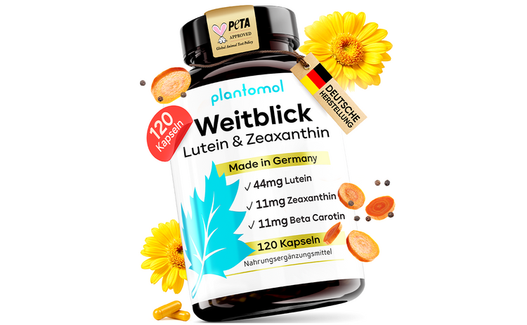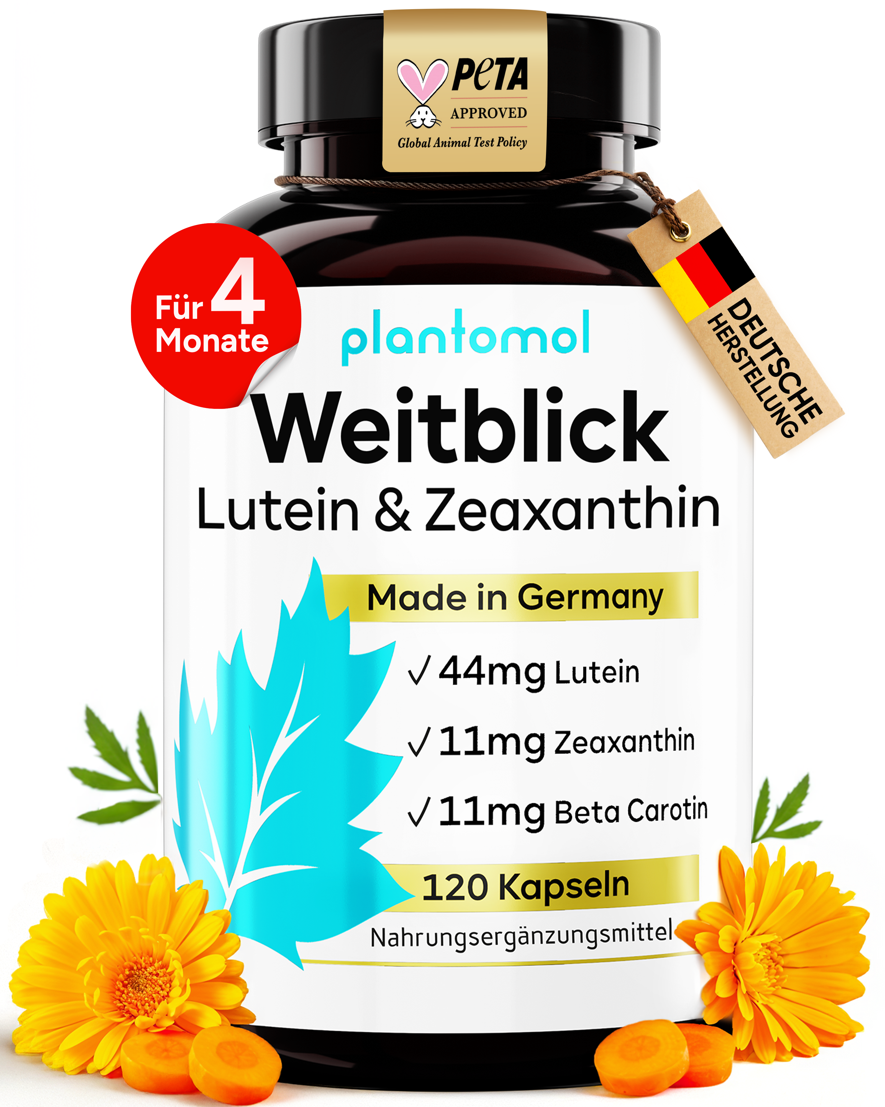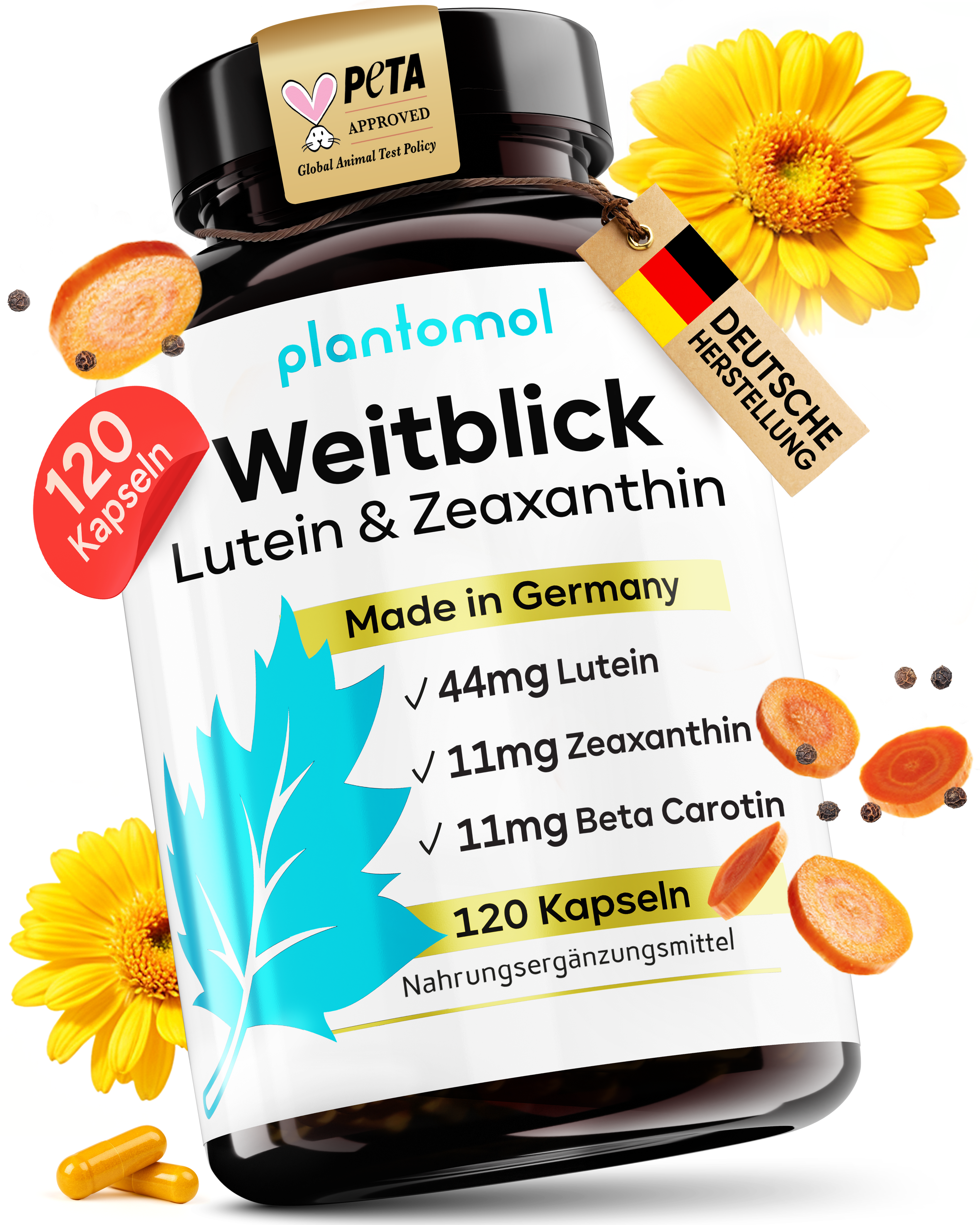 Dieses Hero-Visual zeigt das Produkt in einer klaren, minimalistischen Komposition mit natürlichen Ringelblumen- und Karottenelementen. Die Darstellung betont Reinheit, pflanzliche Qualität und die zuverlässige 4-Monats-Versorgung „Made in Germany“.