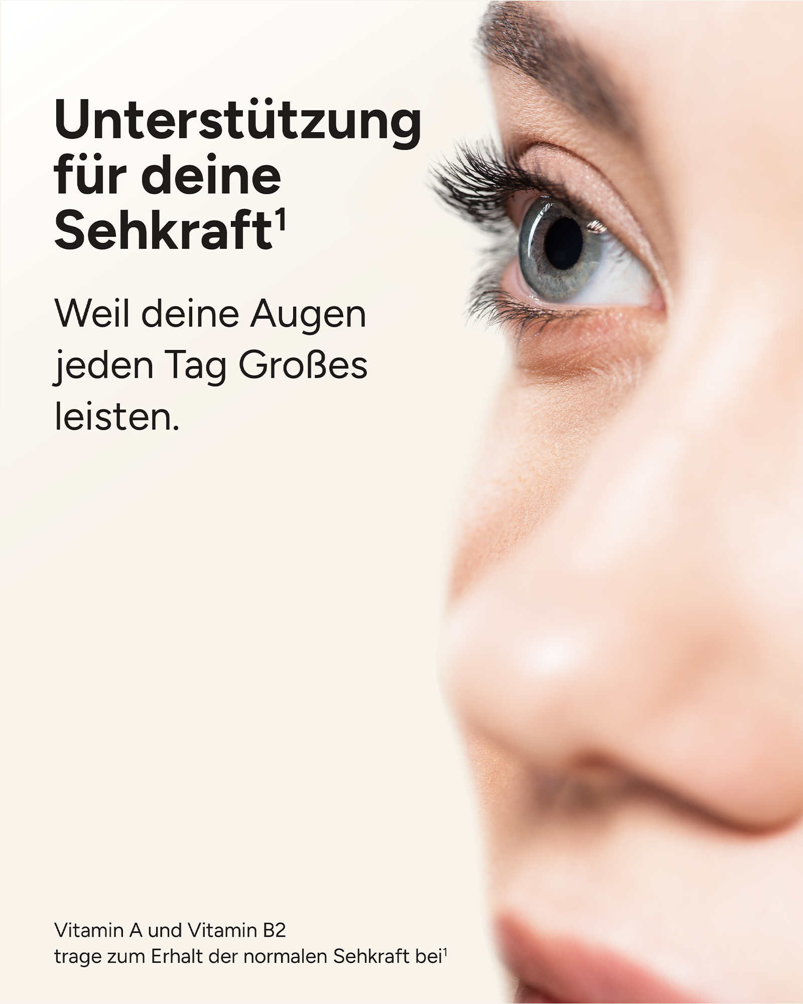 Eine emotionale, hochwertige Lifestyle-Nahaufnahme eines Auges. Die Bildwelt vermittelt Ruhe, Qualität und die Botschaft: „Unterstützung für deine Sehkraft“. Das visuelle Storytelling zeigt, wie wertvoll tägliche Sehleistung ist – und stellt eine emotionale Verbindung zum Nutzen des Produkts her.