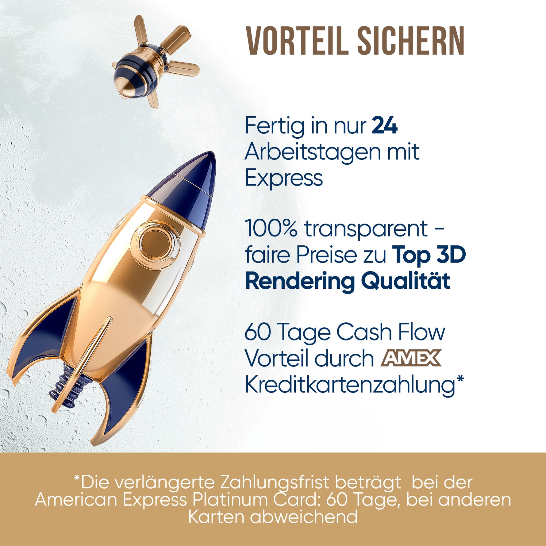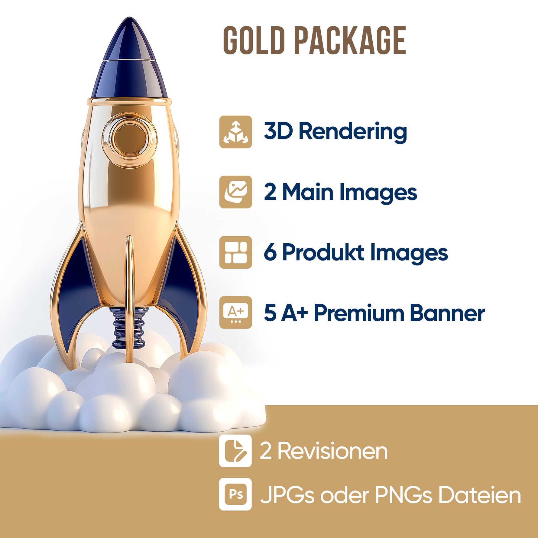 Das Gold Paket enthält 3D Renderings, 2 Hauptbilder, 6 Produktfotos sowie 5 A+ Inhalte + Photoshop Dateien.
