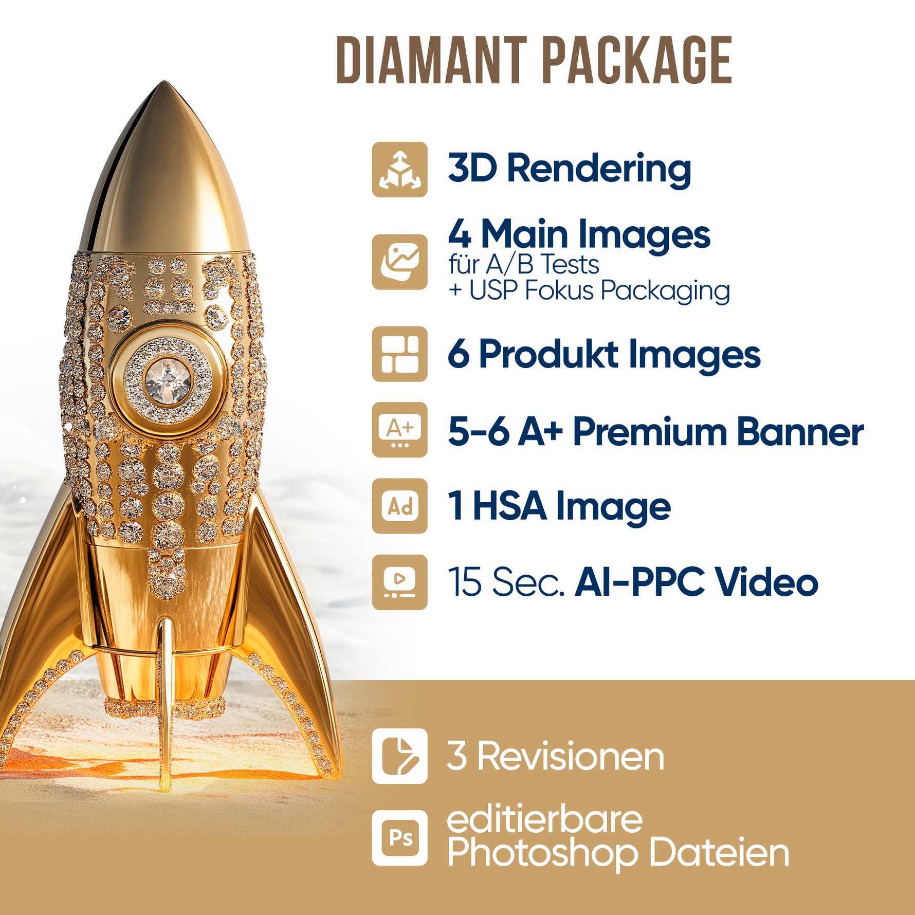 Das Diamant Paket enthält 3D Renderings, 2 Hauptbilder, 6 Produktfotos sowie 5-6 A+ Premium Inhalte inkl. Mobile Version + Photoshop Dateien.